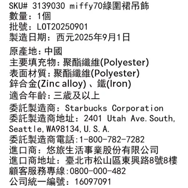 miffy x starbucks 綠圍裙吊飾 Plush Keychain